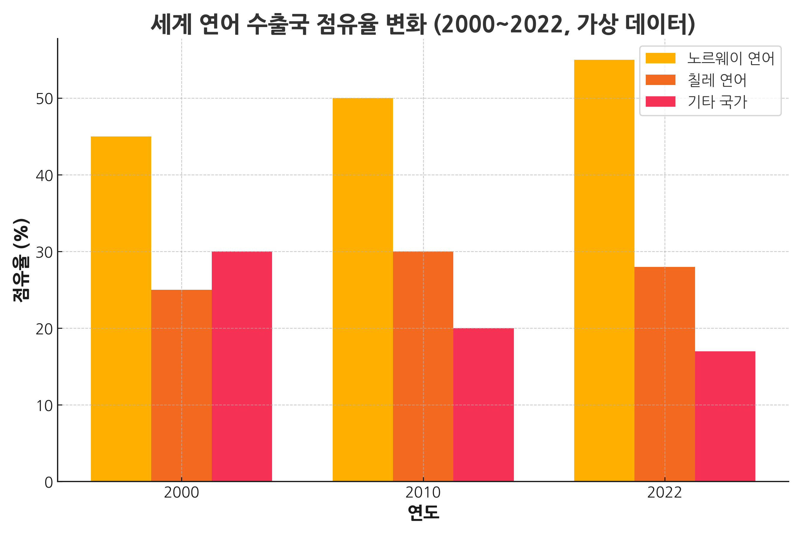 그래프에서 보듯, 노르웨이는 세계 시장 점유율의 55%를 차지하며 독보적 지위를 차지하고 있습니다. 칠레는 30% 내외를 유지하며 뒤를 잇습니다. 한국 식탁에 오르는 연어는 결국 두 나라의 양식 구조와 직결되어 있으며, 한국 소비자 역시 해양 생태계 문제에서 책임을 공유하게 됩니다.